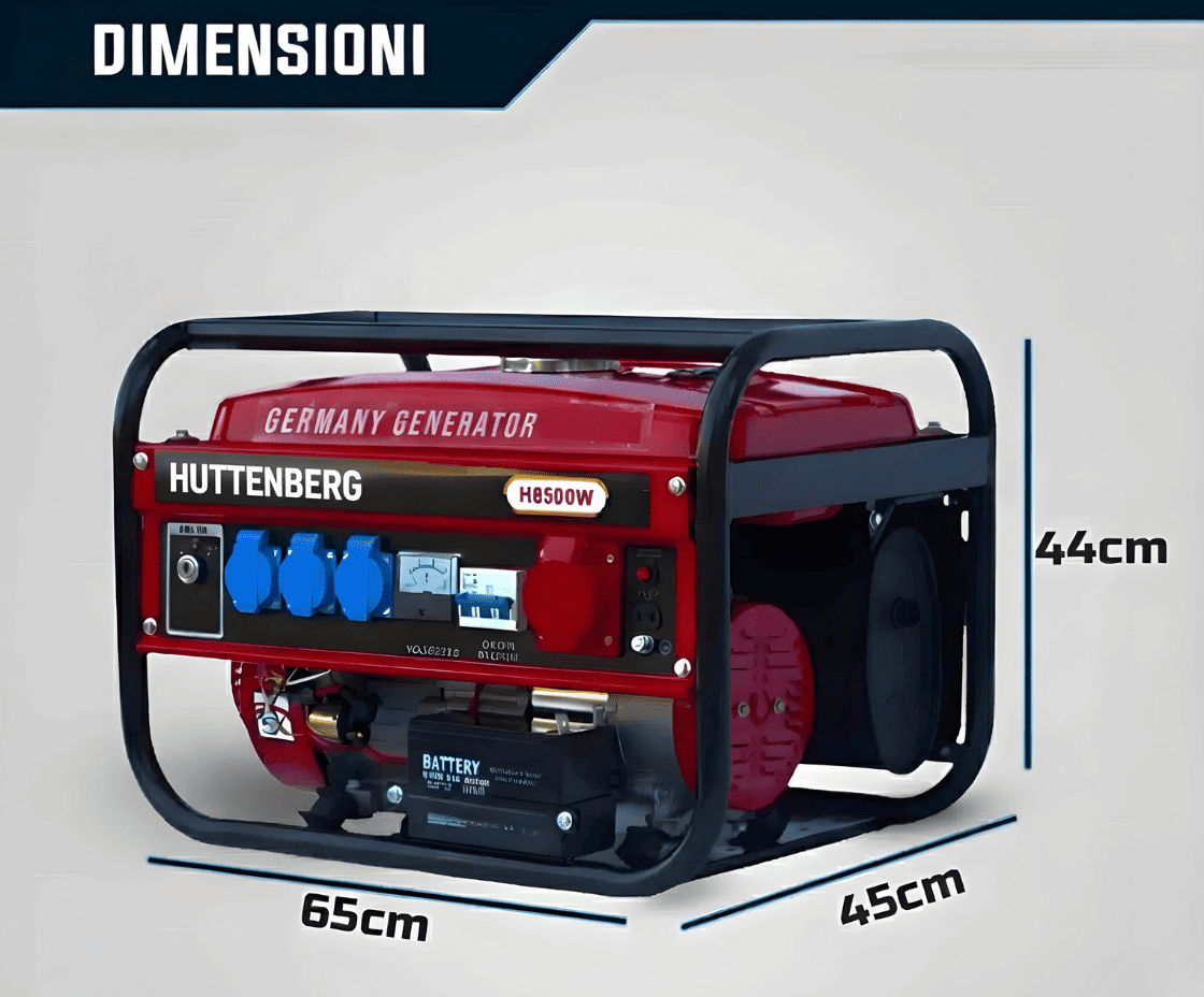 Le dimensioni del generatore sono 65 cm di larghezza, 44 cm di altezza e 45 cm di profondità. 40kg